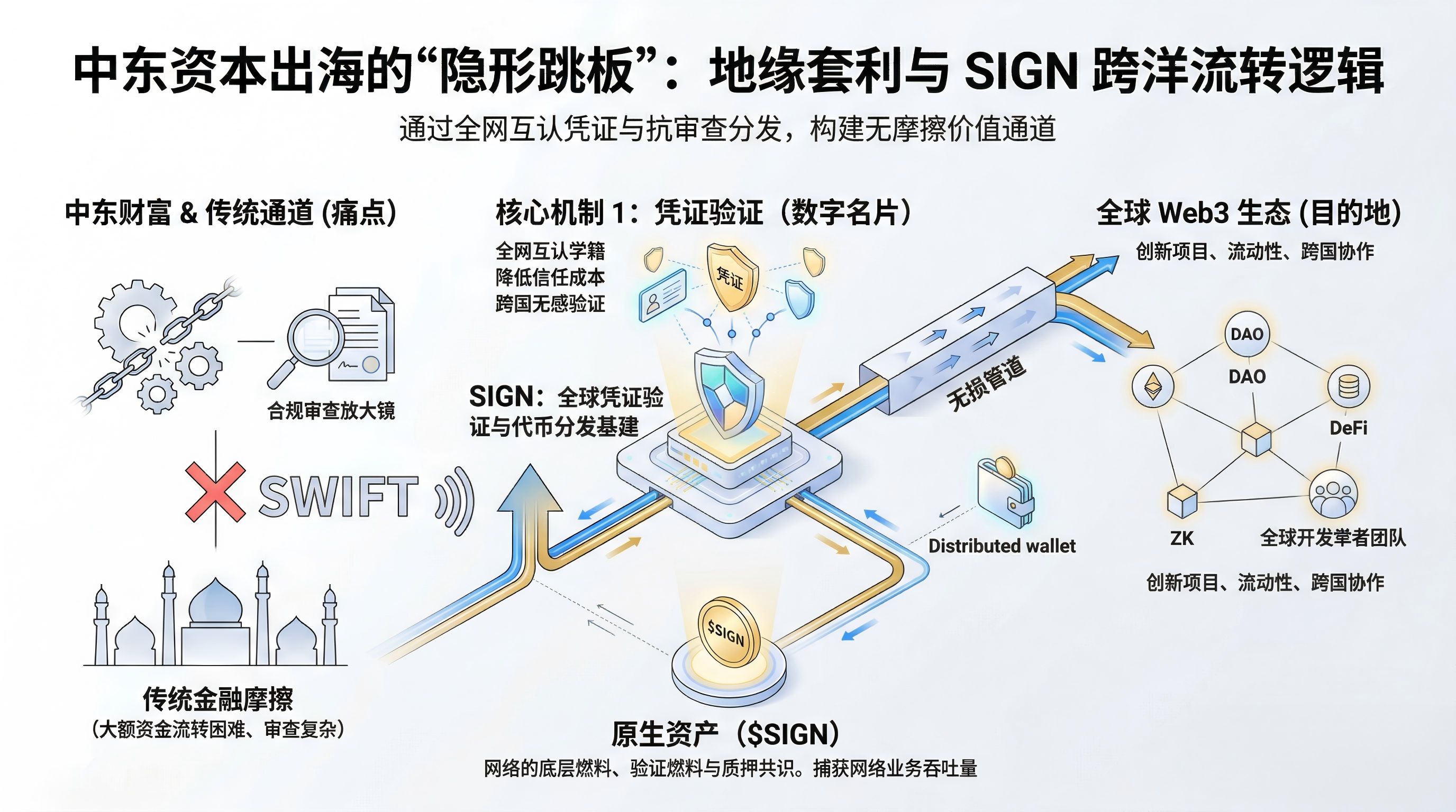 在传统体系下,资本出海意味着漫长的单向审查和层层结算机构的过路费。而 SIGN @SignOfficial 作为一个全球凭证验证与代币分发基础设施,实质上是在为这些寻求全球化配置的中东资本打造一块无摩擦的“数字跳板”。该网络并不涉及资金的传统托管,而是将机构的链上交互历史、资产沉淀以及过往的真实商业信誉,转化为一套全网互认的去中心化加密凭证。