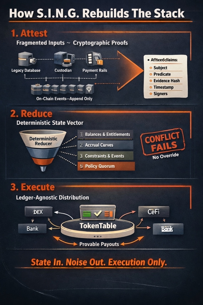 That’s why S.I.N.G avoids the usual traps state-bloat from duplicated records, latency mismatches across systems, hard-coded policy scattered in execution layers. Everything collapses into one flow: