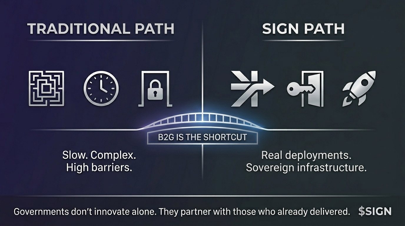 Governments don't innovate alone. They partner with those who already delivered. The traditional path is slow, complex, and built on high barriers. @SignOfficial chose a different route: trusted partner, real deployments, sovereign infrastructure. B2G isn't just a category. It's the shortcut to real adoption.