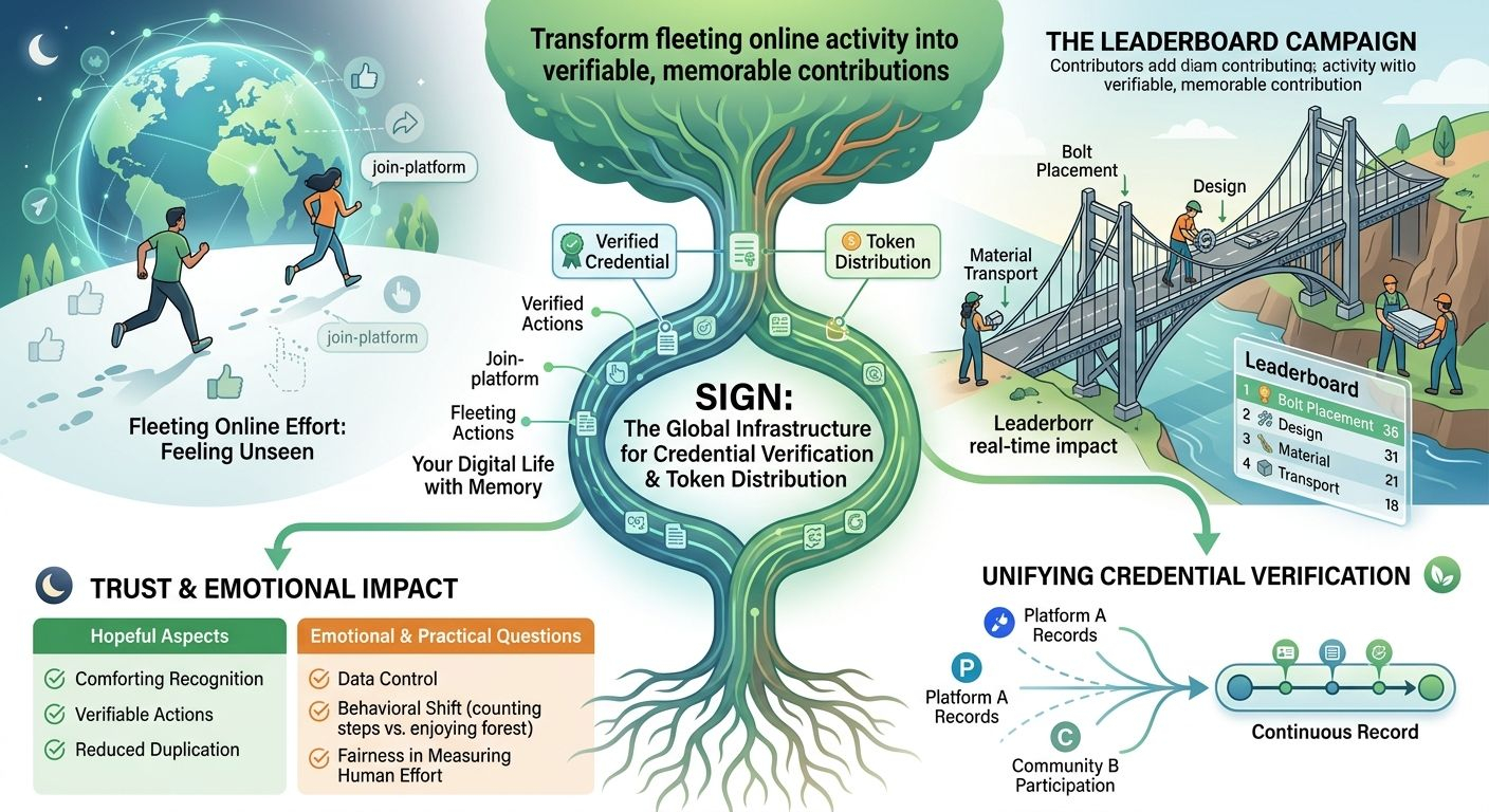 Sometimes the digital world feels like a place where we keep running but never really leave footprints. We join platforms we participate in events we complete tasks we contribute time and energy, but later it all starts to blur together. It can feel like your effort existed for a moment and then quietly disappeared 😶. That feeling of being unseen is more common than people admit. This is where the idea behind SIGN starts to feel emotionally relevant because it is trying to solve something deeply human, not just technical.