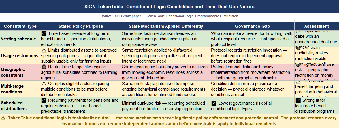 honestly? the capabilities are real and the use cases are legitimate. vesting schedules for long-term benefit programs. multi-stage release conditions that unlock funds when specific eligibility criteria are met. usage restrictions that limit distributed assets to approved categories of spending. geographic constraints that prevent funds from being used outside a defined region. these are tools governments actually need to run responsible public benefit programs.