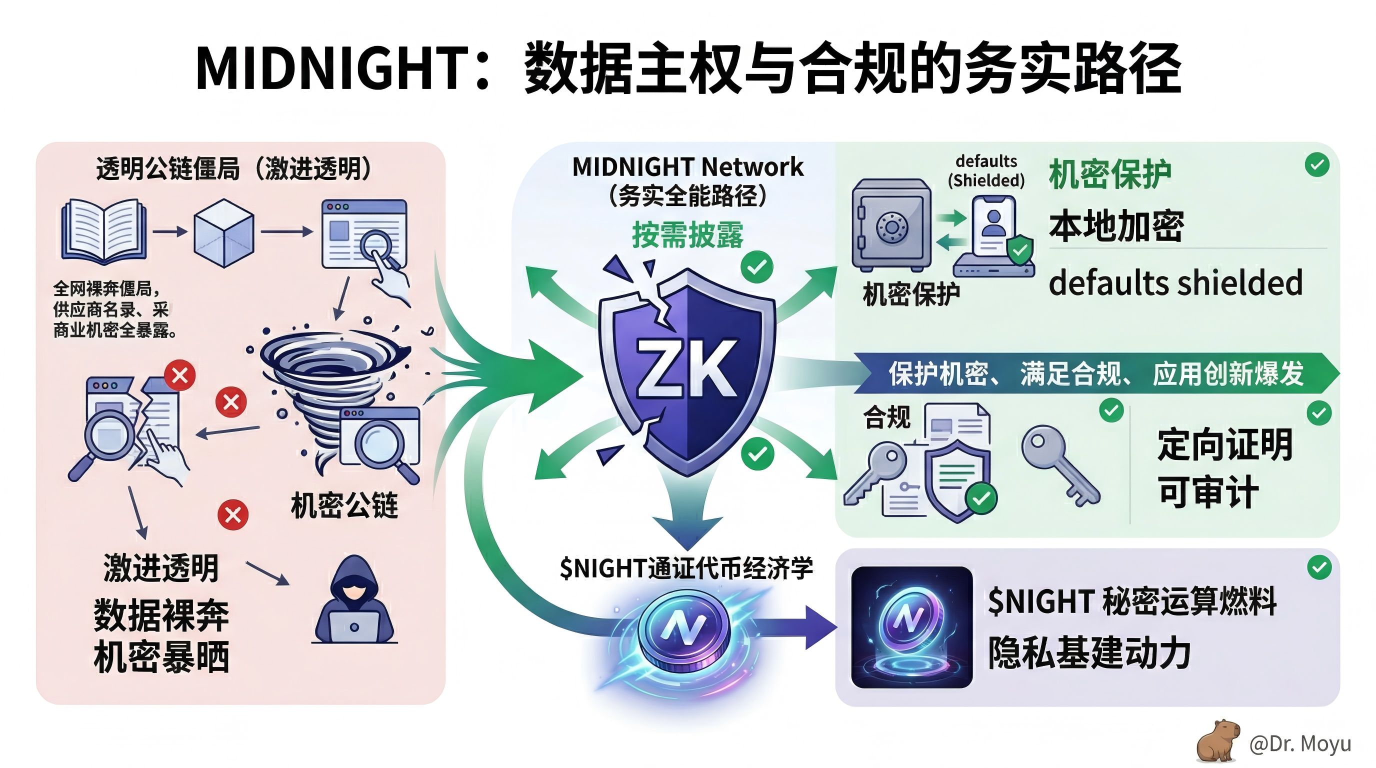 这种“数据本地加密,链上核验清白”的务实机制,真正给庞大的实体产业资金进场扫清了最后的障碍。它保护的不仅仅是一串代码,而是实体企业在残酷竞争中的数据主权和生存根基。在未来万物互联的全球化协作网络中,每一个保密商业条款的链上确权、每一次定向的 ESG 合规披露,都需要消耗 $NIGHT 这种底层专用的密码学运算资源。跳出那些毫无营养的零和炒作去审视,这类试图在透明网络中硬生生撕开务实商业保护伞、让秘密运算成为刚需的基础设施,才是下一波真正能沉淀万亿实体价值的硬核基建。