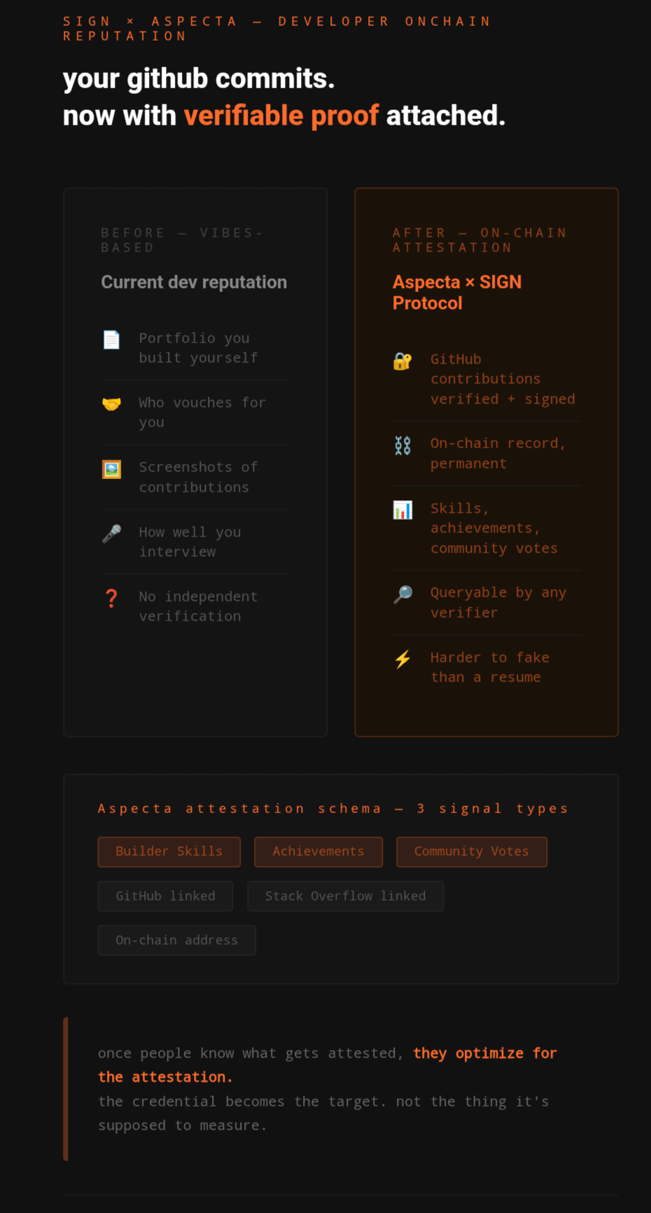 this whole experience came back to me when i was going through SIGN's case study with Aspecta. the idea is straightforward once you see it — your github activity, stack overflow answers, on-chain contributions, all of it gets turned into verifiable attestations through Sign Protocol. builder skills, achievements, community votes. each one cryptographically signed. each one queryable.