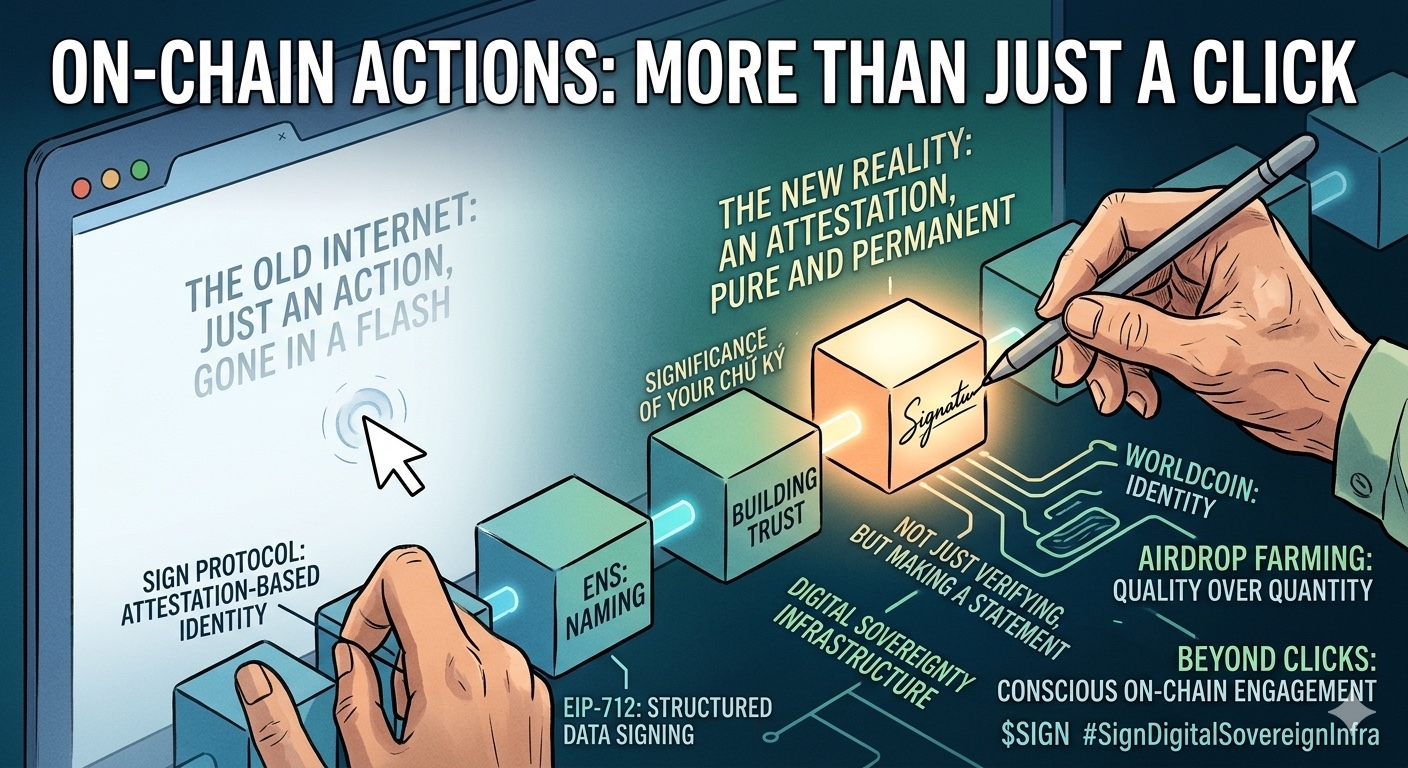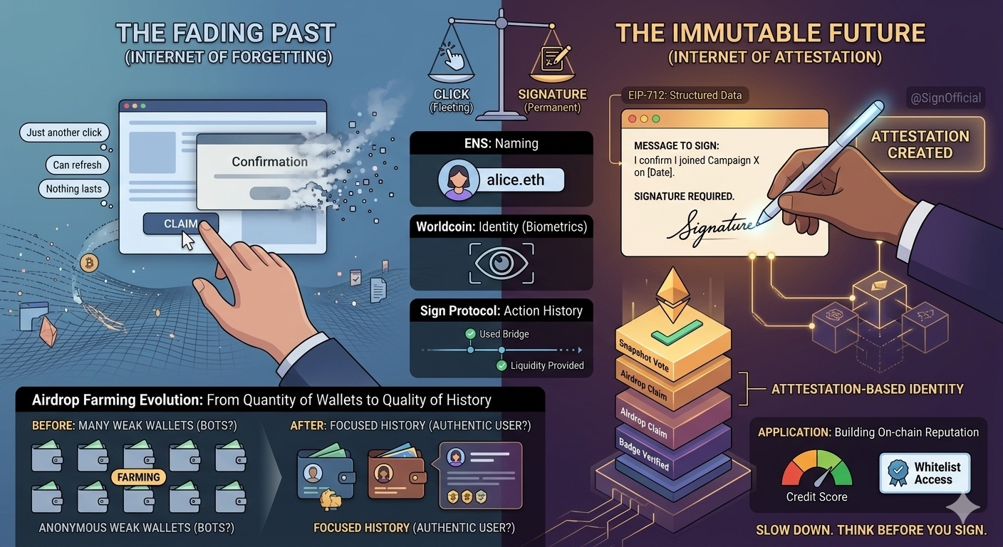 Và Sign Protocol đứng ngay tại vùng xám này. Nếu mỗi click chuột là một sự chứng thực, thì việc "farm" không còn là tạo ví nữa, mà là tạo ra ký ức giả. Đến đây, cảm giác bắt đầu đổi. Không còn là tiện hay không tiện, mà là: "Mỗi lần bấm, mình đang để lại dấu chân gì?".