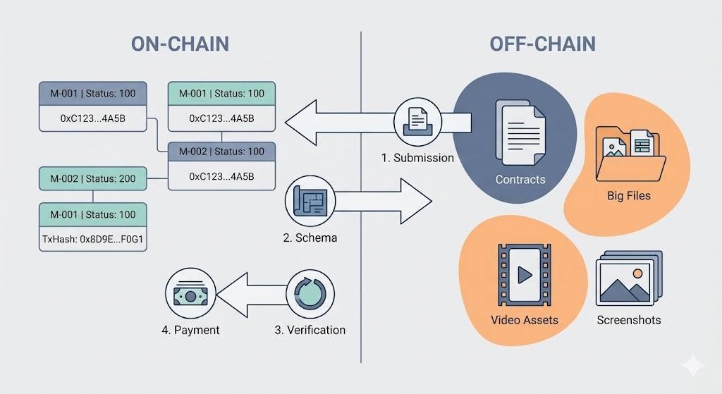 After: I set the schema. They see the rules upfront. They submit proof in my format. The system checks the code verifies the hook and releases the funds away.