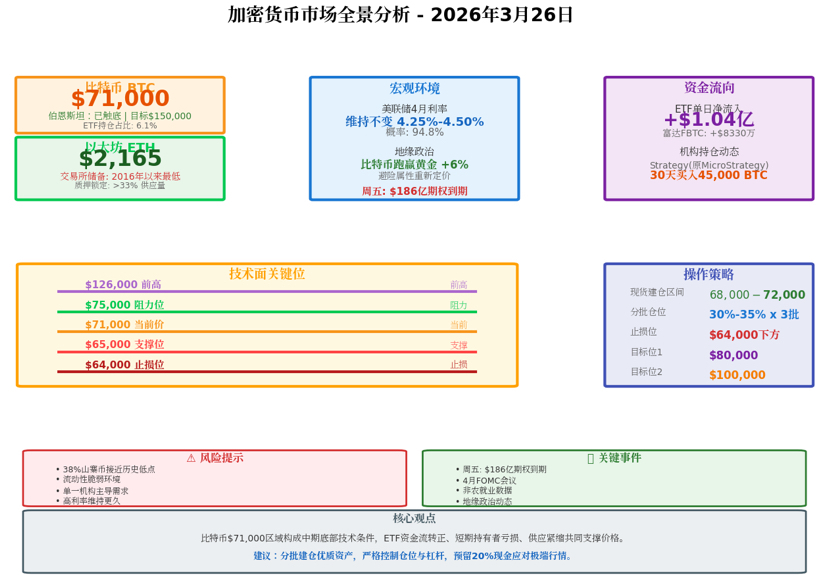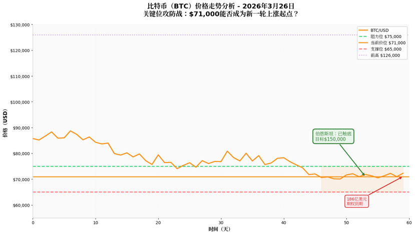 On March 26, 2026, the cryptocurrency market displayed a volatile consolidation trend. Bitcoin hovered around $71,000, with Bernstein analyst Gautam Chughani stating it has "bottomed out" and reaffirming a target price of $150,000 by the end of the year; Ethereum traded around $2,165, with exchange reserves hitting a new low since 2016, over one-third of the supply locked in staking contracts. This Friday, $18.6 billion in Bitcoin options will expire, potentially serving as a key catalyst to break the $75,000 resistance or retest the $65,000 support. The probability of the Federal Reserve maintaining interest rates in April is as high as 94.8%, with the macro liquidity environment still presenting a "higher for longer" pattern.