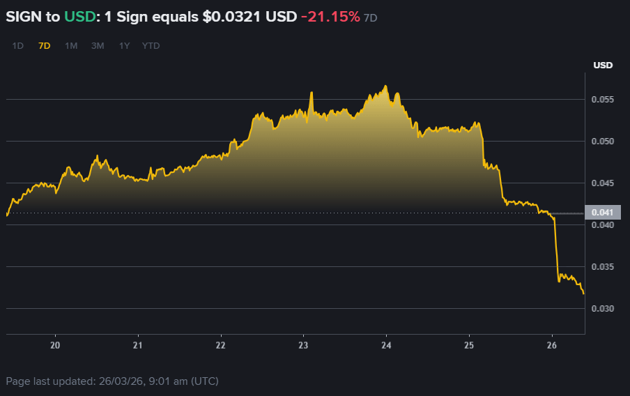 $SIGN is at $0.0347 today. market cap $56.9M. 1.64B circulating out of 10B max. 75% below ATH. Date: March 26, 2026. Sign Token detalis today