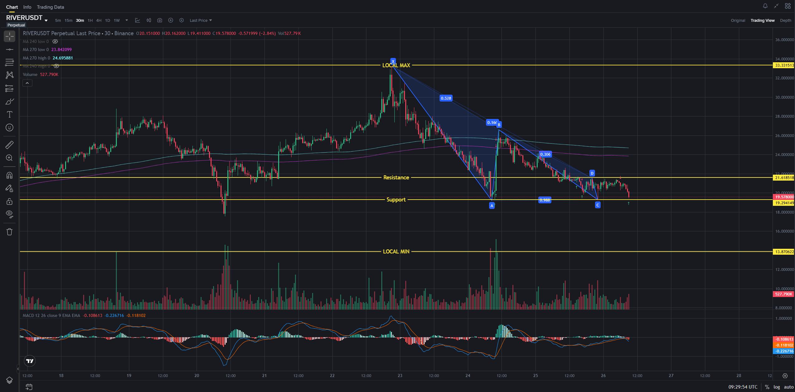Our main line of defense is Support (~19.29). This is a global level where we have repeatedly seen buyer reactions.