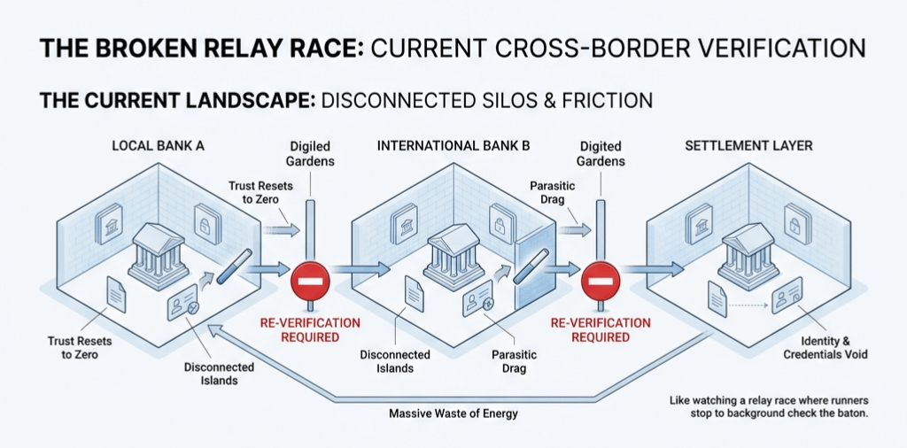 The current landscape is a patchwork of walled gardens where trust has the shelf life of an open gallon of milk. We are stuck in this archaic loop where identity and credentials reset to zero the moment they cross a digital border and it makes the old guard systems look like a series of disconnected islands rather than a unified global economy. You see these massive giants boasting about their digital transformation but the reality is just a bunch of fancy silos that do not talk to each other. Every time a deal moves from a local bank to an international settlement layer it has to scream its credentials into the void all over again. It is a massive waste of cognitive and computational energy that treats every verified participant like a complete stranger until they prove their worth for the tenth time that day.