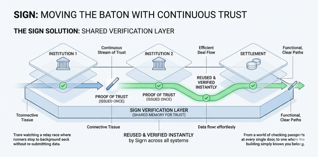I used to think that the friction in Middle East deal flow was just a cultural quirk or a byproduct of high-stakes caution until I spent an afternoon watching a mid-sized cross-border settlement grind to a halt for no apparent reason. The capital was sitting right there and the handshake was firm but the entire process hit a wall because one system refused to acknowledge a verification that had already happened ten minutes prior in another environment. It was like watching a relay race where the runners stop to perform a background check on the baton before they start running their leg. This is the quiet tax on growth that nobody talks about in the glitzy brochures for regional expansion and it is exactly why I started paying attention to Sign after ignoring the noise for months.
