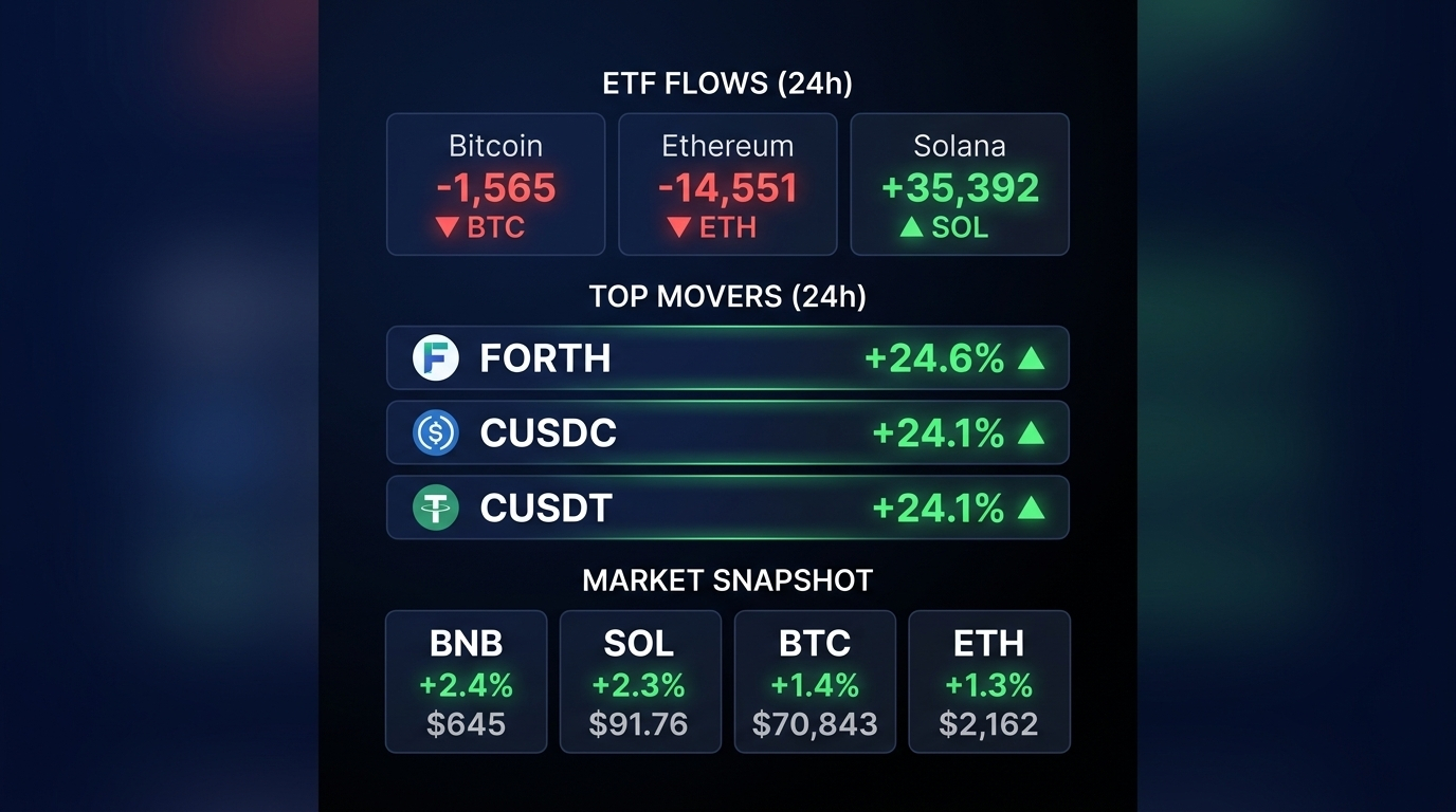 BNB is up 2.4% to $645. Solana climbed 2.3% to $91.76. Bitcoin touched $70,843, up just over 1%. Ethereum lagged a bit at $2,162.