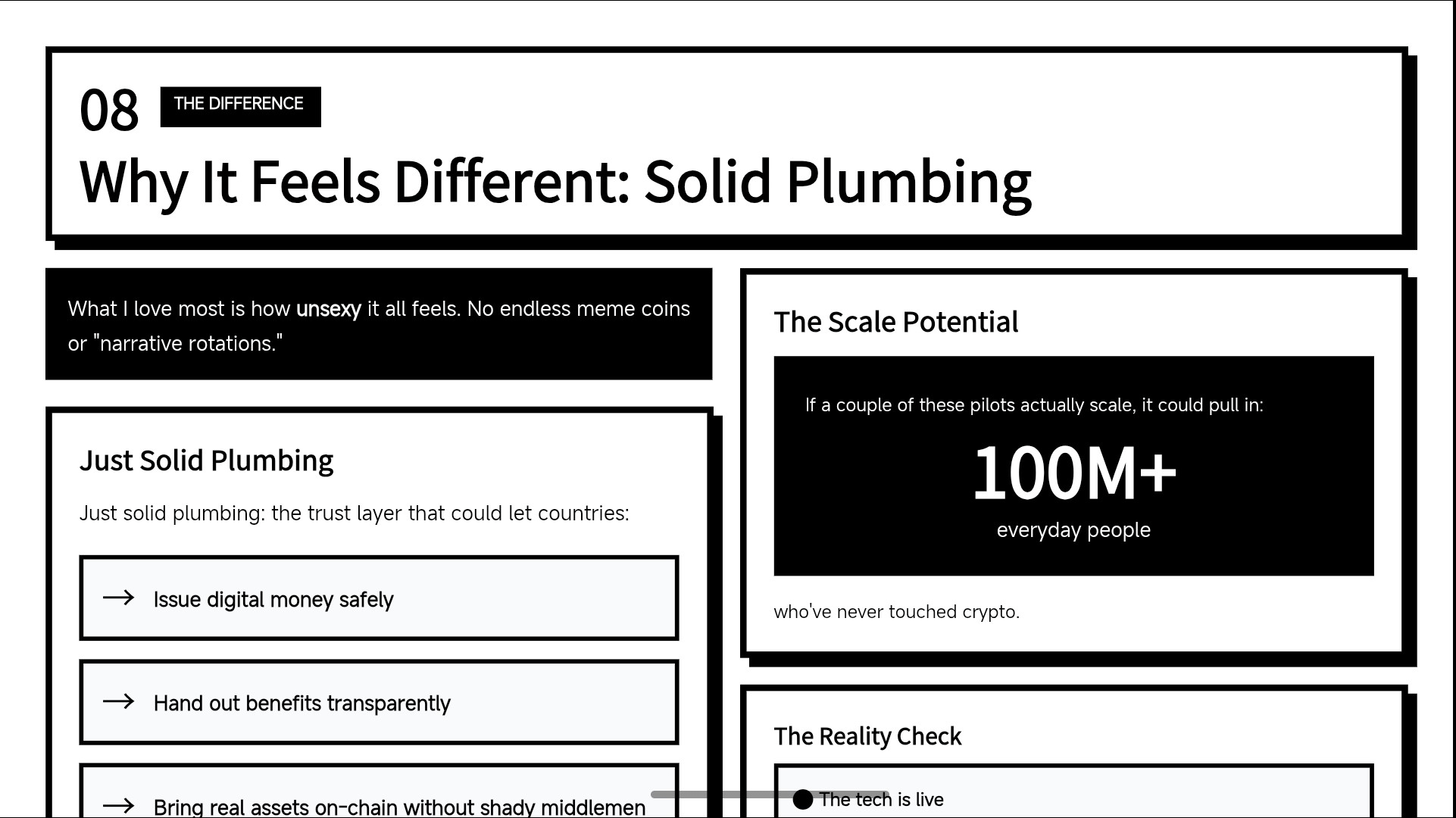 What I love most is how unsexy it all feels. No endless meme coins or “narrative rotations.” Just solid plumbing: the trust layer that could let countries issue digital money safely, hand out benefits transparently, and bring real assets on-chain without the usual shady middlemen. If a couple of these pilots actually scale, it could pull in hundreds of millions of everyday people who’ve never touched crypto. The tech is live, the users are there, and governments are treating them like a serious partner instead of some fly-by-night startup.