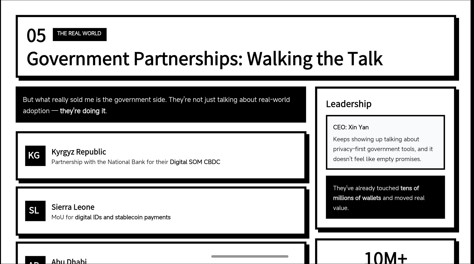 But what really sold me is the government side. They’re not just talking about real-world adoption — they’re doing it. Partnerships with places like the National Bank of Kyrgyz Republic for their Digital SOM CBDC, an MoU with Sierra Leone for digital IDs and stablecoin payments, and work with the Blockchain Centre Abu Dhabi on public records. Their CEO, Xin Yan, keeps showing up talking about privacy-first government tools, and it doesn’t feel like empty promises. They’ve already touched tens of millions of wallets and moved real value.