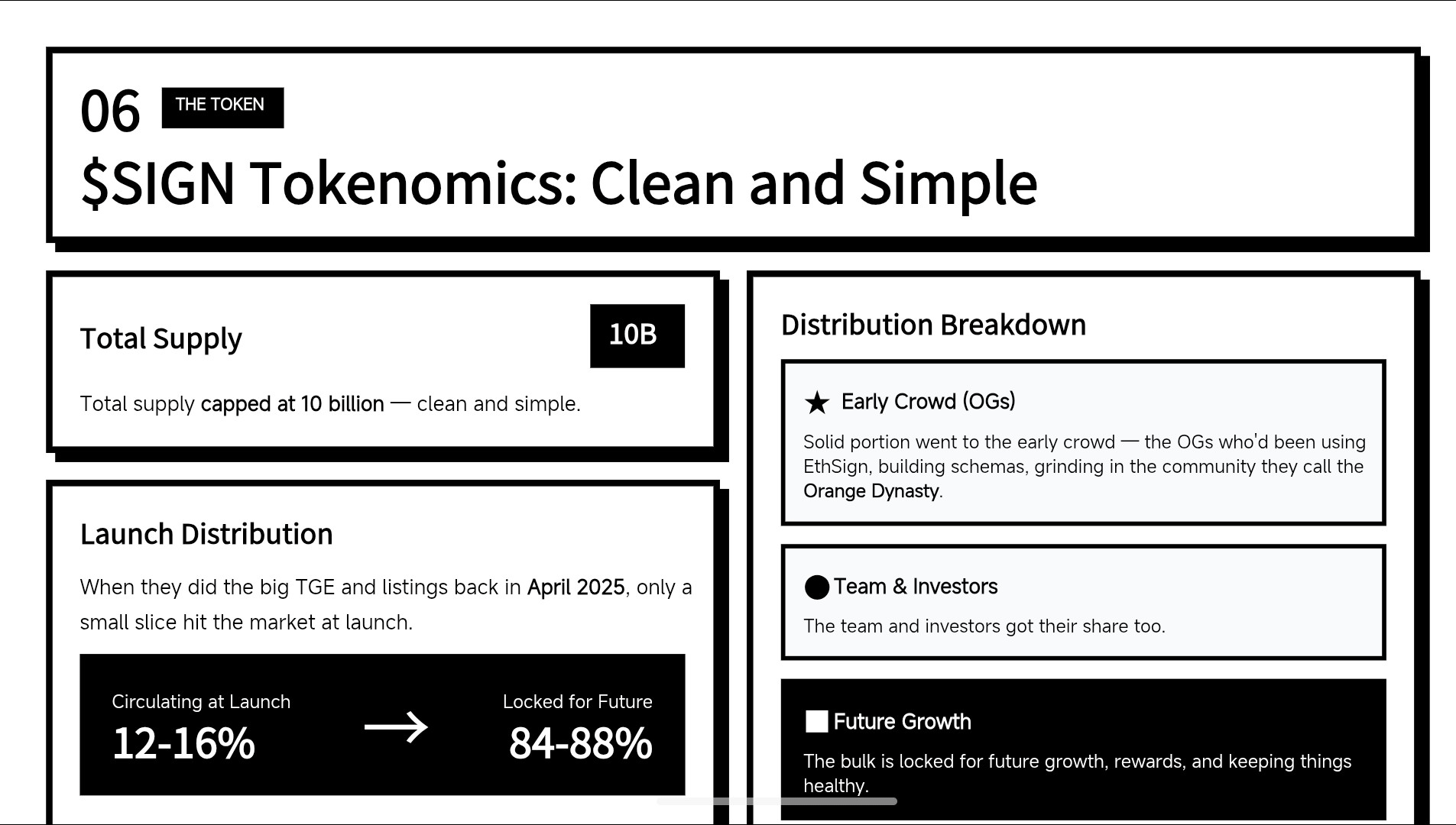 Now the $SIGN token. Total supply capped at 10 billion — clean and simple. When they did the big TGE and listings back in April 2025, only a small slice (around 12-16%) hit the market at launch. The rest was split in a way that actually felt fair: a solid portion went to the early crowd — the OGs who’d been using EthSign, building schemas, grinding in the community they call the Orange Dynasty. The team and investors got their share too, but the bulk is locked for future growth, rewards, and keeping things healthy. You spend $SIGN on attestations, stake it for governance, unlock premium features... it’s literally the fuel. They call it the “community currency,” and it shows — you earn it by actually participating, not just buying the dip.