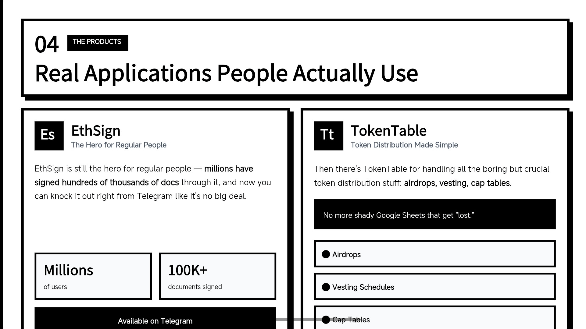The apps they’ve built are the part I actually use (or at least have played around with). EthSign is still the hero for regular people — millions have signed hundreds of thousands of docs through it, and now you can knock it out right from Telegram like it’s no big deal. Then there’s TokenTable for handling all the boring but crucial token distribution stuff: airdrops, vesting, cap tables. No more shady Google Sheets that get “lost.”