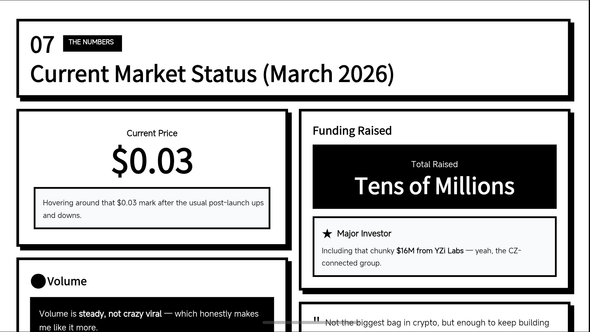 Right now, end of March 2026, it’s hovering around that $0.03 mark after the usual post-launch ups and downs. Volume is steady, not crazy viral, which honestly makes me like it more. They’ve raised real money along the way (tens of millions, including that chunky $16M from YZi Labs — yeah, the CZ-connected group). Not the biggest bag in crypto, but enough to keep building without the constant hype-chasing.
