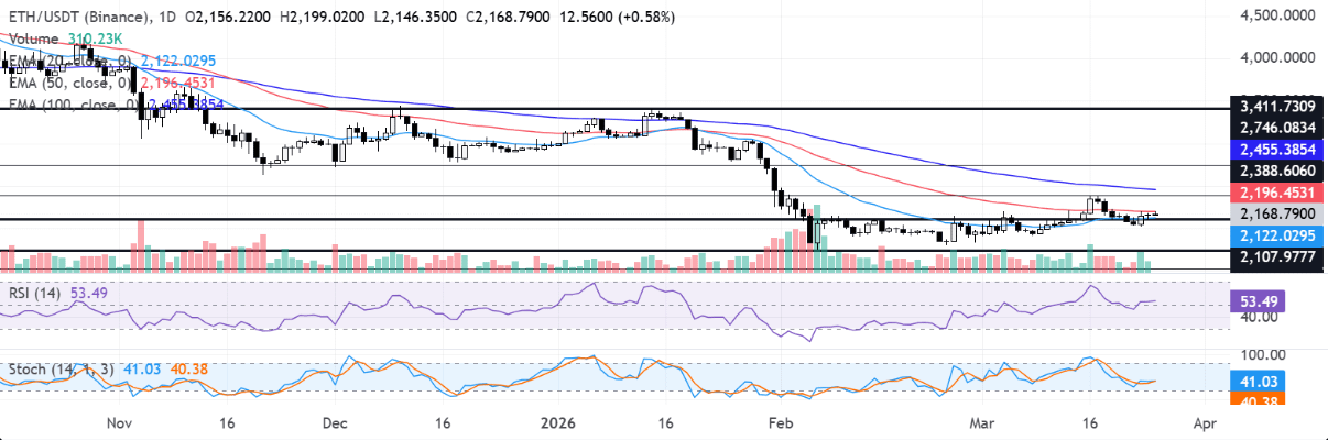 On the daily timeframe, ETH is currently trading around 2,160 USD. The short-term trend is slightly leaning towards the upside as the price maintains above the 20-day EMA (around 2,120 USD) and gradually separates from the previous accumulation area around 2,050 USD.