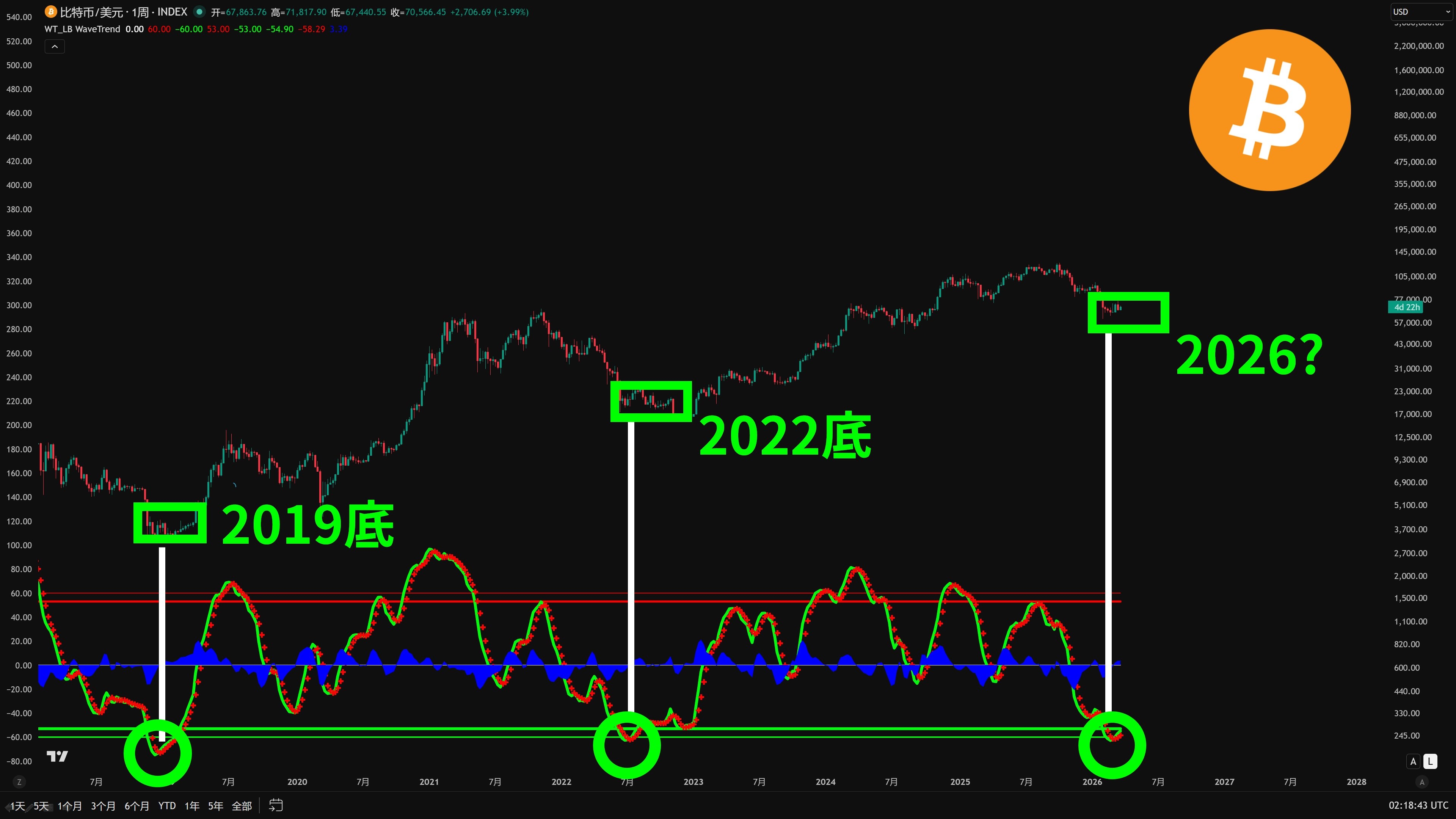 As shown in the figure, the current $BTC weekly WaveTrend indicator is approaching, or even touching, the green circle area that marked two historical bottoms.