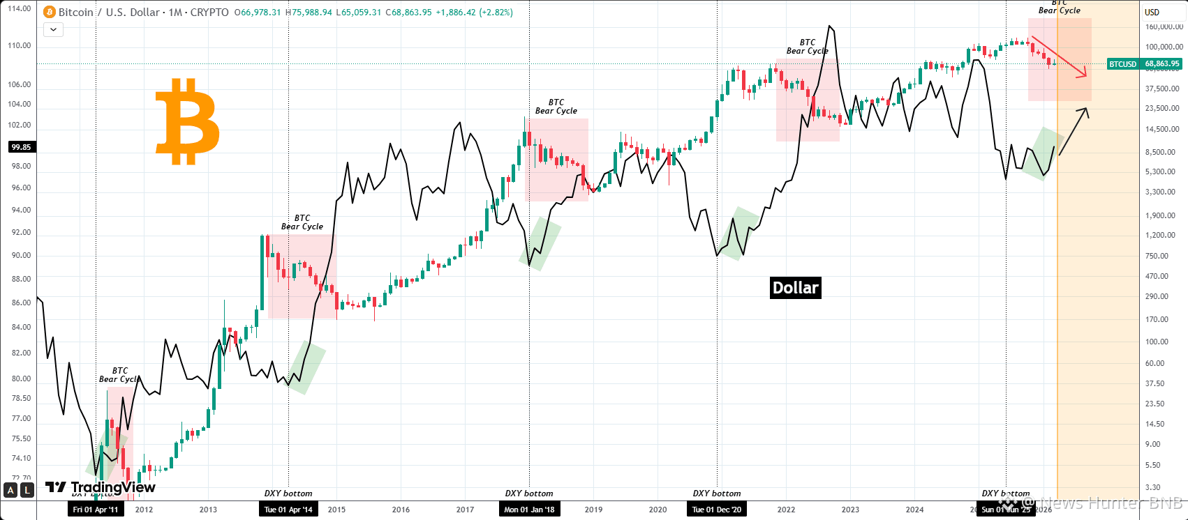 Based on this, what this chart shows though that the Dollar is about to start a new multi-year rally while Bitcoin has already been within its new Bear Cycle since October 2025.