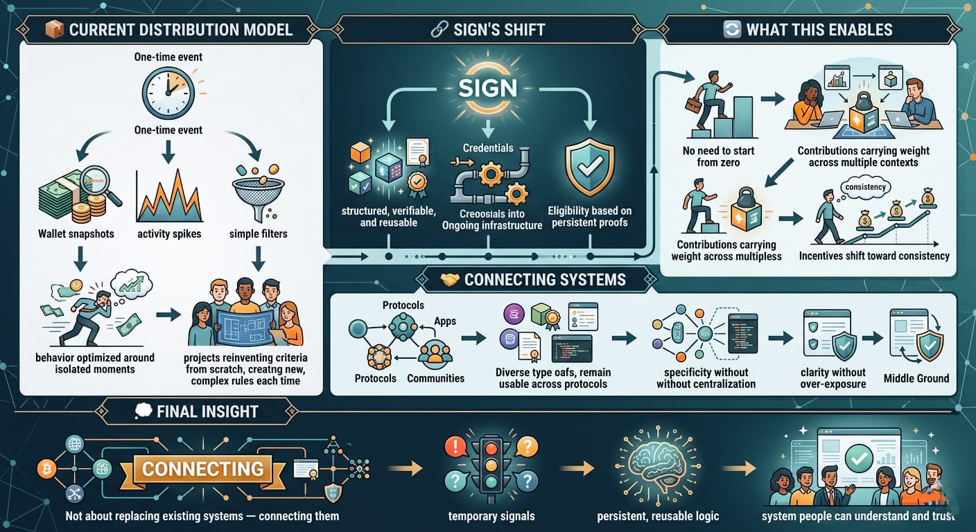 What makes this interesting isn’t just that SIGN deals with credentials it’s how those credentials shift the role of distribution itself. Instead of treating distribution as a one-time event (like an airdrop or incentive campaign), it begins to look more like an ongoing, structured system where eligibility can be defined, verified, and reused. That subtle change has bigger implications than it seems. It means projects don’t have to start from zero every time they want to reward users or contributors. They can build on existing proofs things that already happened, already verified rather than guessing based on surface-level activity.