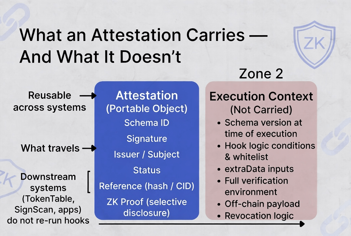 Whatever survives gets pulled into attestation creation. And this is where the layers start tightening, one by one. Schema check. Issuer binding. Authority validation. Hook logic. ZK selective disclosure. Storage decisions. Each step strips away a little more context. By the time you get a signed, portable attestation, it’s no longer the original situation. It’s the compressed residue that made it through every single filter.