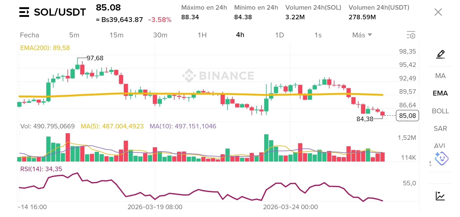 Resistencia (El Techo a Superar): Para que volvamos a estar optimistas a corto plazo, SOL debe recuperar y consolidarse por encima de los $86.64. Más importante aún, necesita romper la EMA 200 en los $89.50.