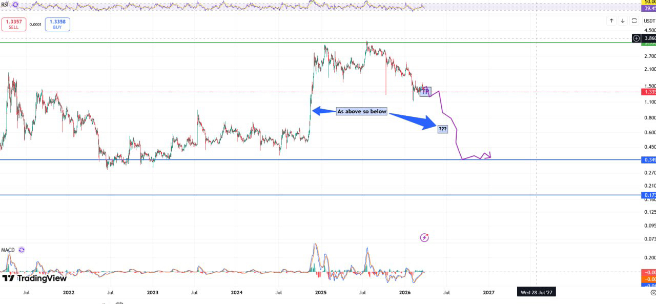 OG soared from $4 to $25 before collapsing back down to just $2. Similarly, XRP spiked from $0.50 to $3.50, only to stabilize around $1.32 today. Yet, the patterns are almost identical one that suggests a deep retracement. Just as OG fell sharply after its peak, so too might XRP, potentially returning to $0.35.