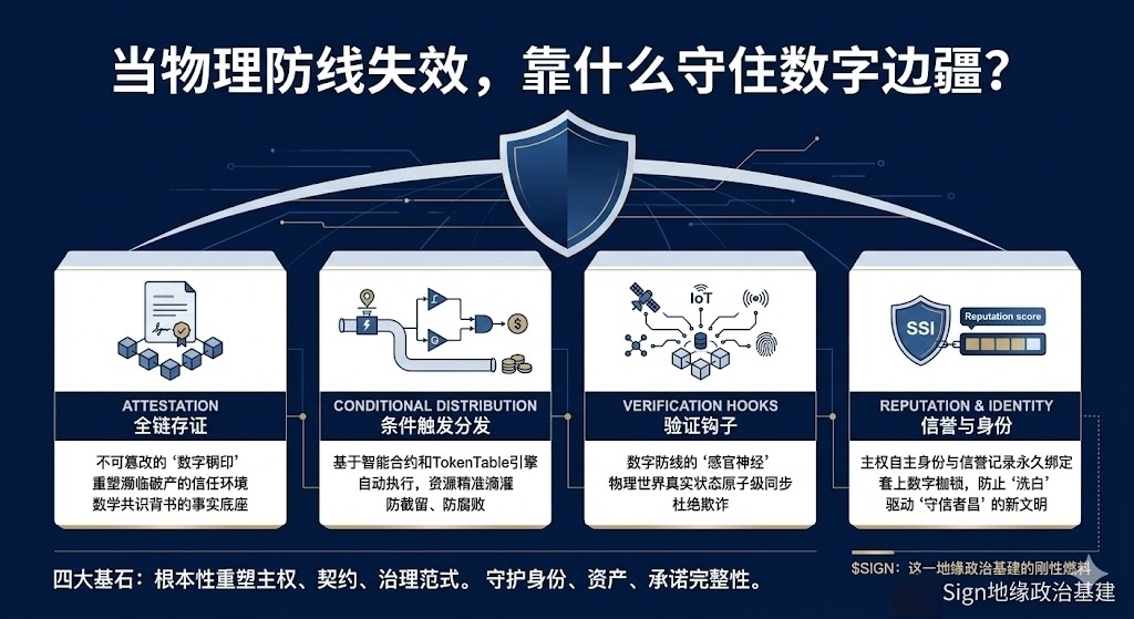 At three in the morning, I was once again awakened by notifications about the situation in the Middle East. What I was staring at on the screen wasn't the casualty numbers, but the code in my portfolio that was showing green against the trend: $SIGN . In this era where artillery can easily tear apart geographical boundaries, I, a long-time observer in the cryptocurrency space, clearly saw the outline of another defense line for the first time. It is not constructed from concrete and barbed wire, but built from the four cornerstones of Attestation, Conditional Distribution, Verification Hooks, and Reputation & Identity, forming a digital Great Wall.