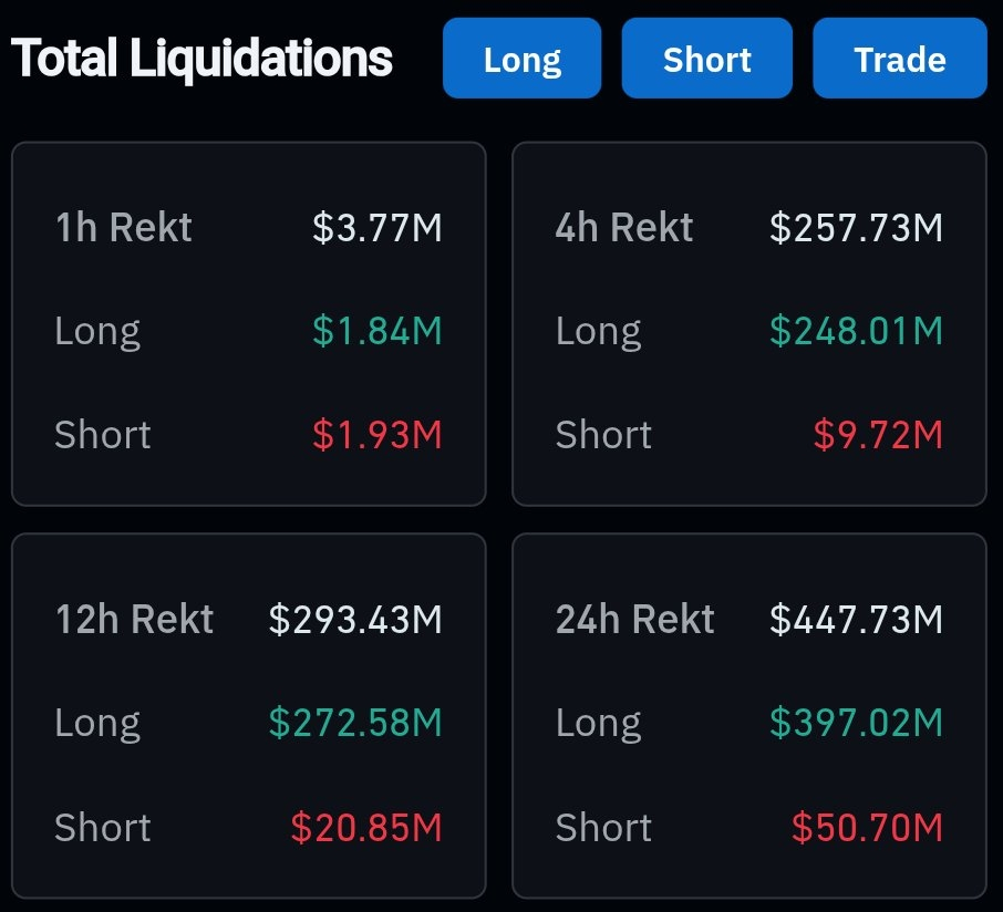 The market just saw a brutal flush as over $250M in long positions were wiped out within hours.