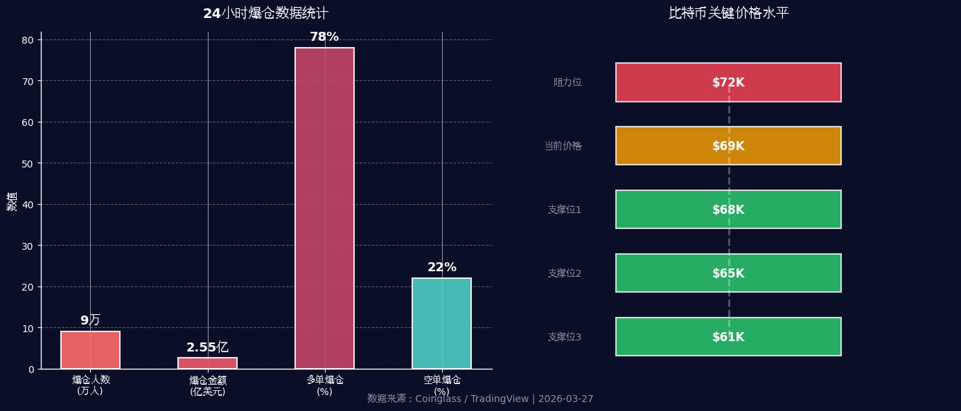 On March 27, 2026, the cryptocurrency market continued the downward trend from the previous trading day, with Bitcoin's price dipping to the $69,000 level, while Ethereum and major altcoins also faced pressure. The geopolitical risks in the Middle East continue to escalate, coupled with tightening expectations for U.S. monetary policy, leading to increased market risk aversion. In the past 24 hours, over 90,000 people were liquidated, with the liquidation amount reaching $255 million. Technical indicators show that Bitcoin's key support level is under pressure, and in the short term, it may maintain a volatile consolidation pattern. Investors are advised to manage their positions and pay attention to the evolution of macro risk events.