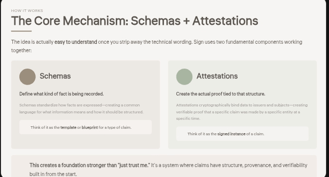 What I like is that the idea is actually easy to understand once you strip away the technical wording. Sign uses schemas to define what kind of fact is being recorded, and attestations to create the actual proof tied to that structure. So instead of just saying something happened, the system gives you a way to express it in a format that can be checked later by other apps, other users, or other systems. Sign’s own documentation says schemas standardize how facts are expressed, while attestations cryptographically bind data to issuers and subjects. That is a much stronger foundation than “just trust me.”