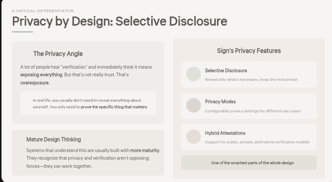 Another part I genuinely find compelling is the privacy angle. A lot of people hear the word “verification” and immediately think it means exposing everything. But that is not really trust. That is overexposure. Sign’s official product pages explicitly mention selective disclosure, privacy modes, and support for public, private, and hybrid attestations. To me, that is one of the smartest parts of the whole design. In real life, you usually do not need to reveal everything about yourself. You only need to prove the specific thing that matters. Systems that understand that are usually built with more maturity.