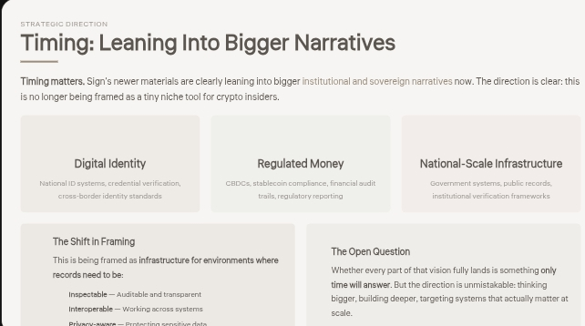 I also think timing matters here. Sign’s newer materials are clearly leaning into bigger institutional and sovereign narratives now, including digital identity, regulated money, and national-scale infrastructure. Whether every part of that vision fully lands is something only time will answer. But the direction is clear: this is no longer being framed as a tiny niche tool for crypto insiders. It is being framed as infrastructure for environments where records need to be inspectable, interoperable, and privacy-aware at the same time.