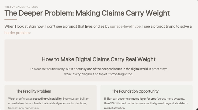 So when I look at Sign now, I do not really see a project that lives or dies by surface-level hype. I see a project trying to solve a harder problem: how to make digital claims carry real weight. That does not sound flashy, but it is actually one of the deepest issues in the digital world. If proof stays weak, everything built on top of it stays fragile too. And if Sign can keep becoming a trusted layer for that proof across more systems, then $SIGN could matter for reasons that go well beyond short-term market attention. That is what keeps me interested.