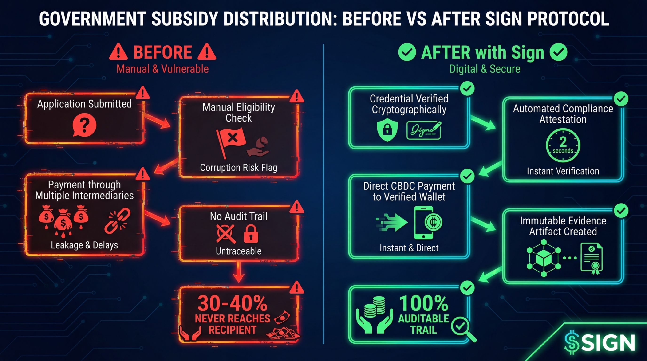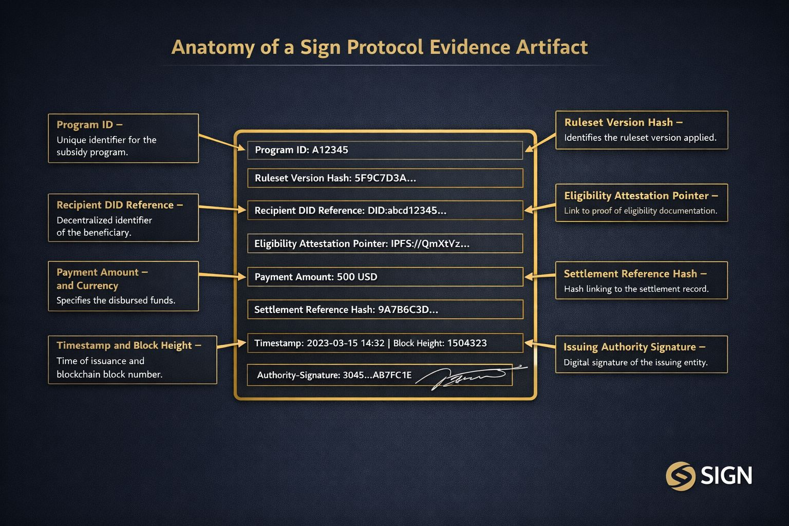 With Sign Protocol's architecture the flow becomes something fundamentally different. Eligibility is verified against a signed credential. The credential check produces a cryptographic attestation. The disbursement batch is generated with a signed manifest that includes a ruleset hash, meaning you can prove exactly which rules were applied. Each payment is settled and its settlement reference is logged as an evidence artifact. A regulator or inspector can audit the entire program retrospectively and cryptographically verify that every step followed the defined rules.