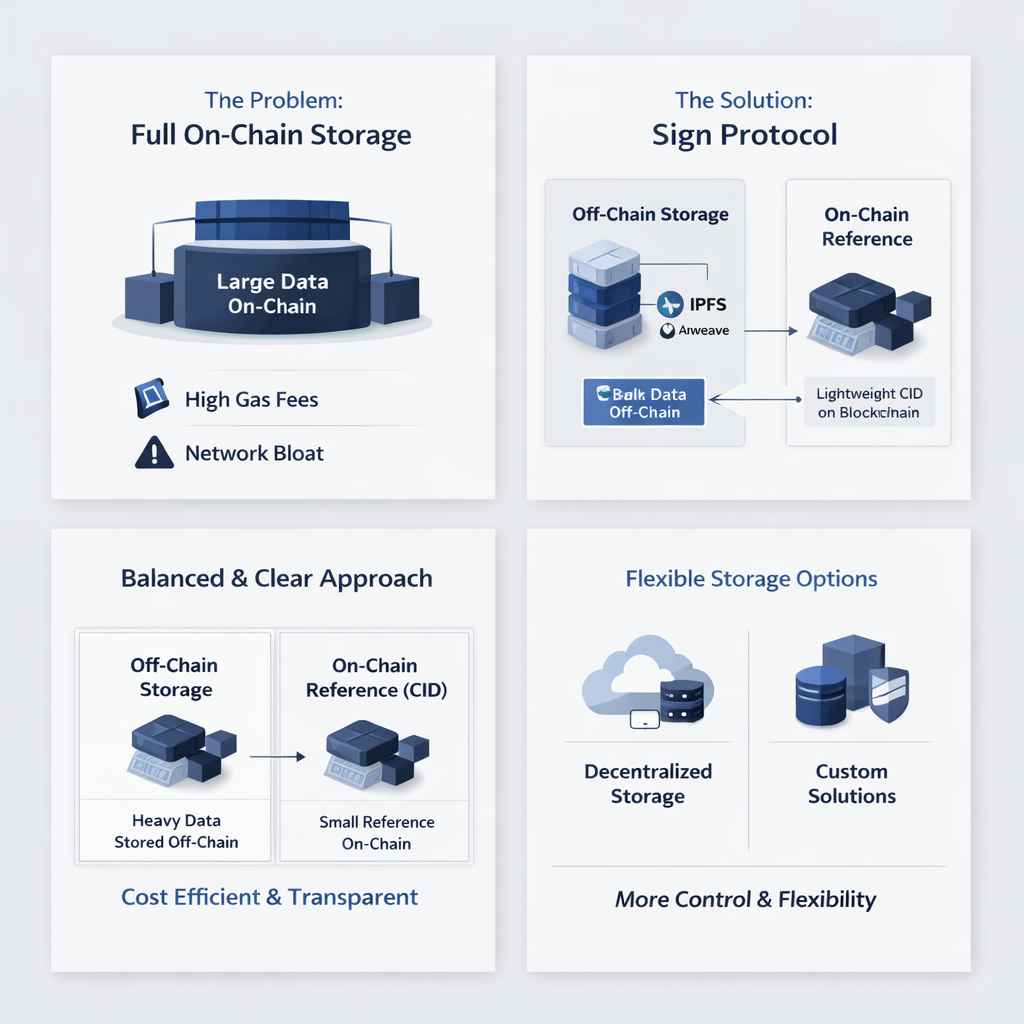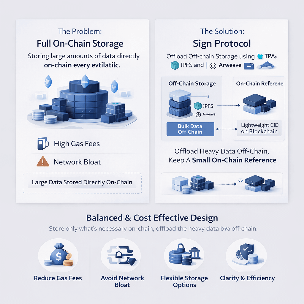 Instead of pushing all attestation data fully on-chain, it takes a more balanced route. Heavy or bulky data gets stored off-chain using systems like Arweave or IPFS, while the blockchain only holds a lightweight reference, usually something like a CID. That small reference still points to the full data, so nothing is lost, but the chain itself stays clean and efficient.