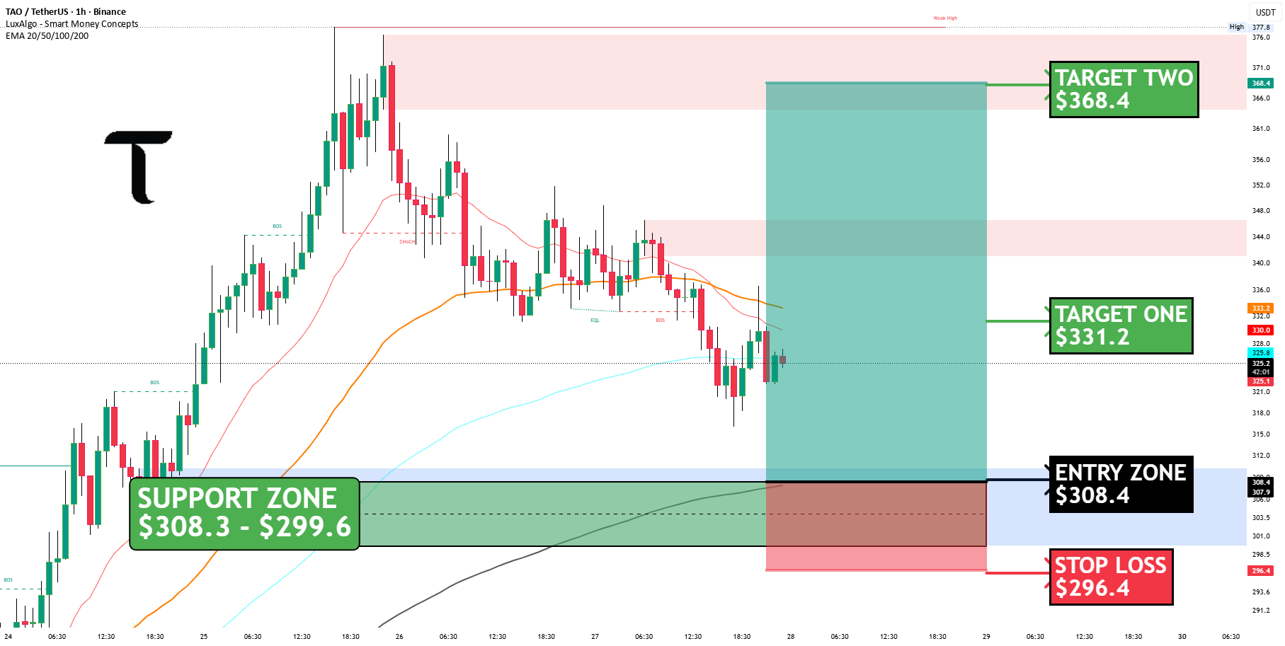 Pair $TAO in an excellent technical "buy" area, provided the price remains stable above the $300 area. Trading in these areas offers an excellent "risk to reward" ratio.