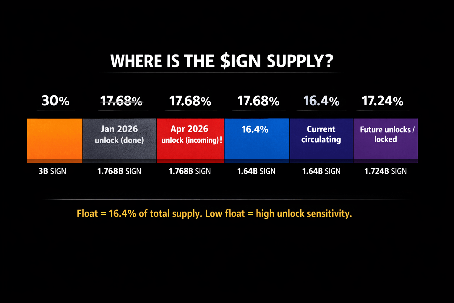Current circulating supply sits at 1.64B SIGN out of 10B total — that's 16.4%. Very low float, which theoretically reduces sell pressure now but amplifies risk with every future unlock.