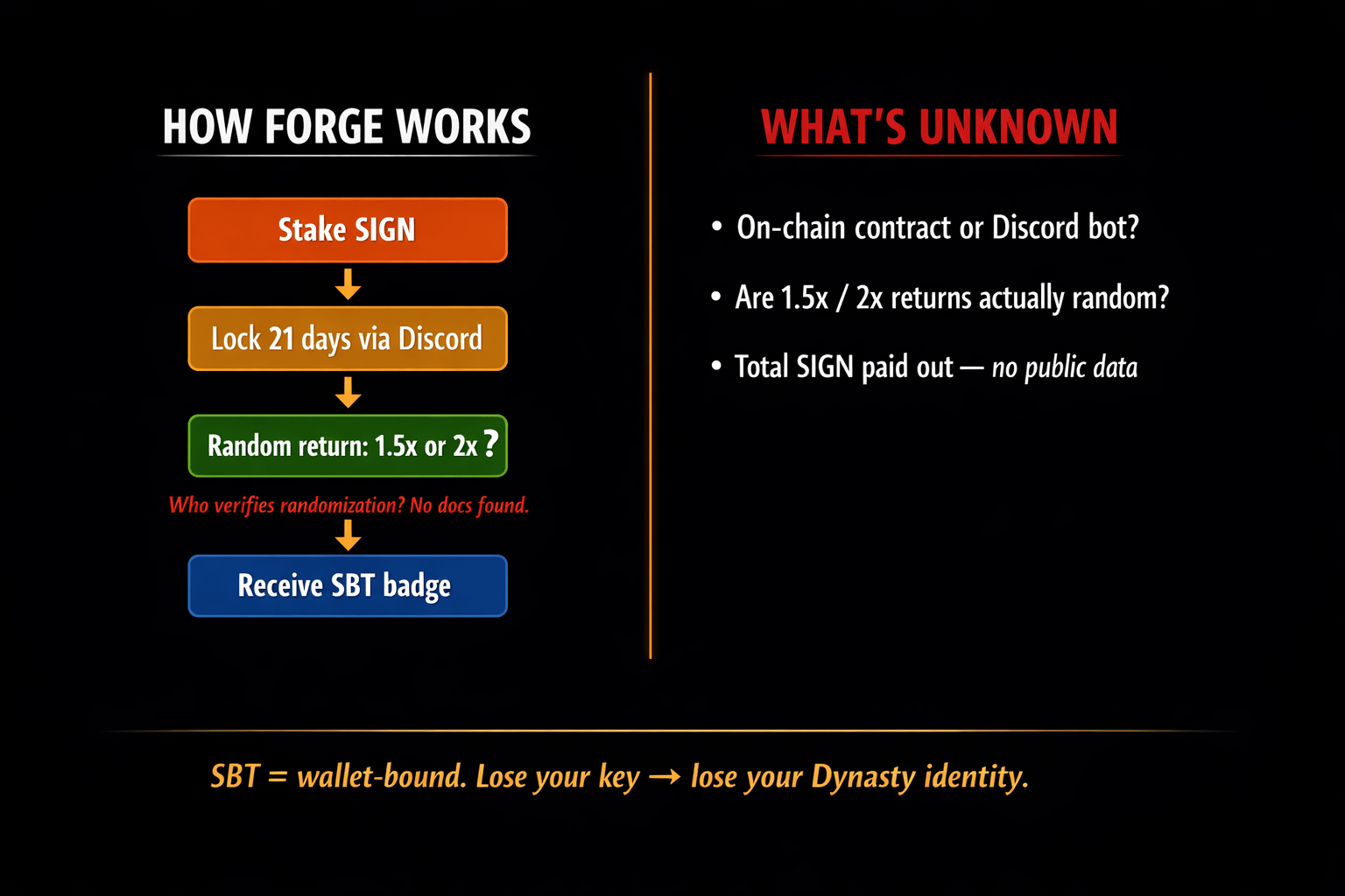 Dynasty Forge is a mechanic inside the Orange Dynasty app where you stake SIGN for 21 days and receive 1.5x or 2x random returns. Activation happens through Discord — meaning social interaction is a condition of your payout. This isn't just yield farming. It's yield farming with behavioural lock-in baked in.
