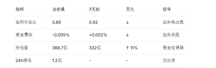 持仓量在涨,多空比在震荡,资金费率转负但很浅。