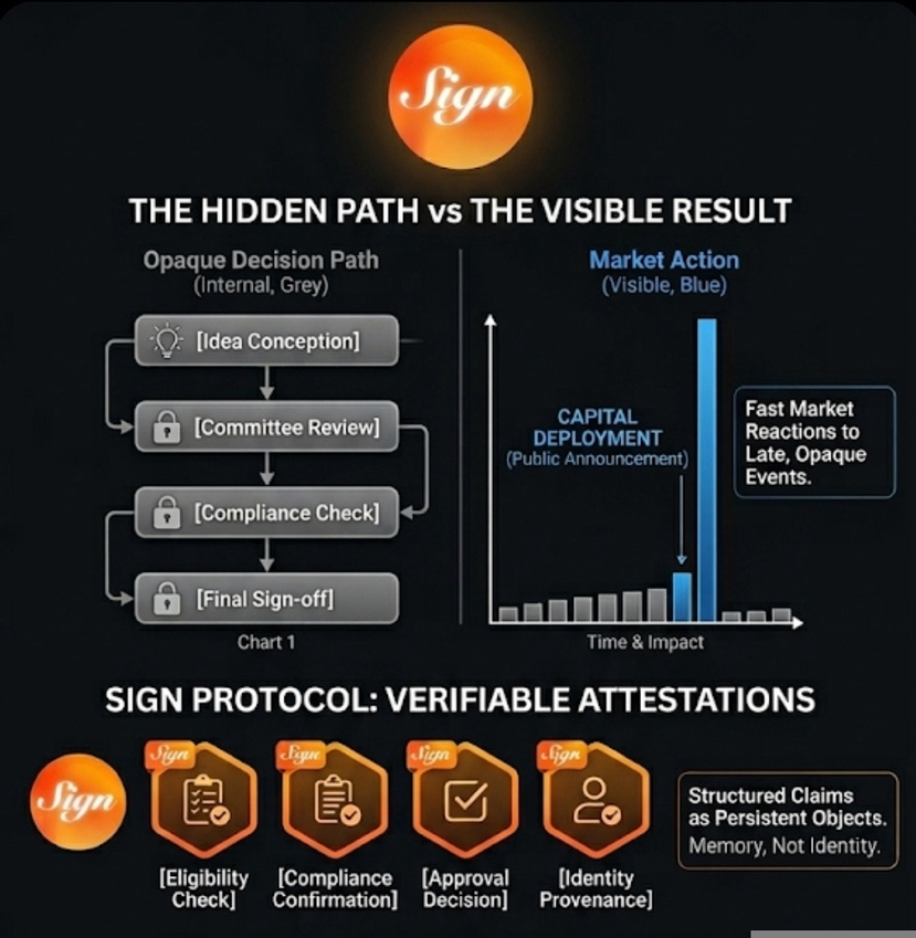I first started thinking about Sign when I realized how invisible most economic decisions are to the markets that depend on them. I’ve watched prices move, narratives shift, and traders scramble to interpret outcomes, but almost never do we see the decisions themselves the approvals, the compliance checks, the eligibility confirmations that actually set things in motion. Markets respond to what’s observable: announcements, filings, transactions. The real work happens quietly, behind closed doors, and the market only sees the tail end.