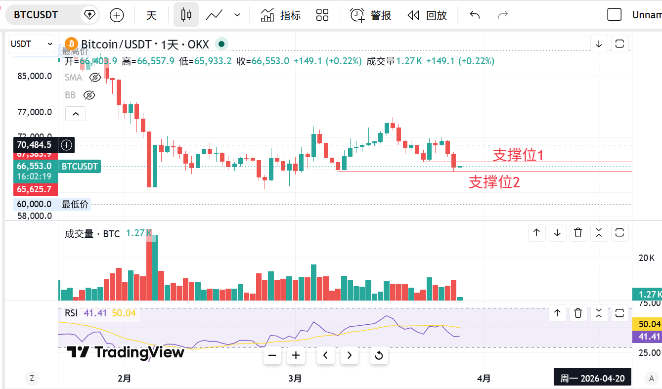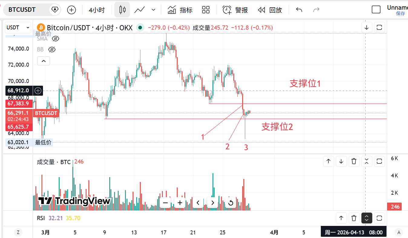 昨天随着美股继续下跌,#比特币 跌破了支撑位1,甚至轻微跌破了支撑位2,而且昨天下跌成交量明显放大,大于3.17-3.19的下跌成交量,咋一看似乎是明显的利空信号,但是用4小时K线来看成交量细节的话,并没有那么悲观: