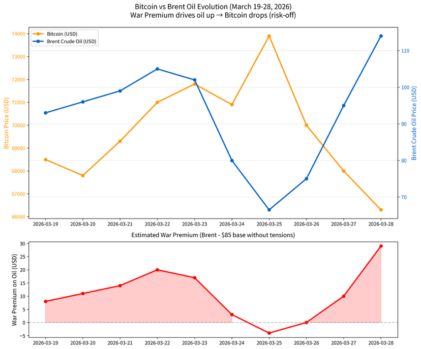 Clear inverse correlation: every time oil spikes (due to war premium), Bitcoin drops (risk-off)