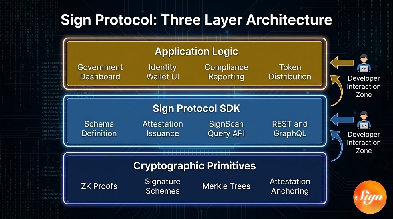 Sign Protocol does this through what I think of as a clean three layer model. At the bottom you have the cryptographic primitives. Zero knowledge proofs signature schemes Merkle trees for attestation anchoring. This layer is highly specialized and you do not need to touch it as an application developer.