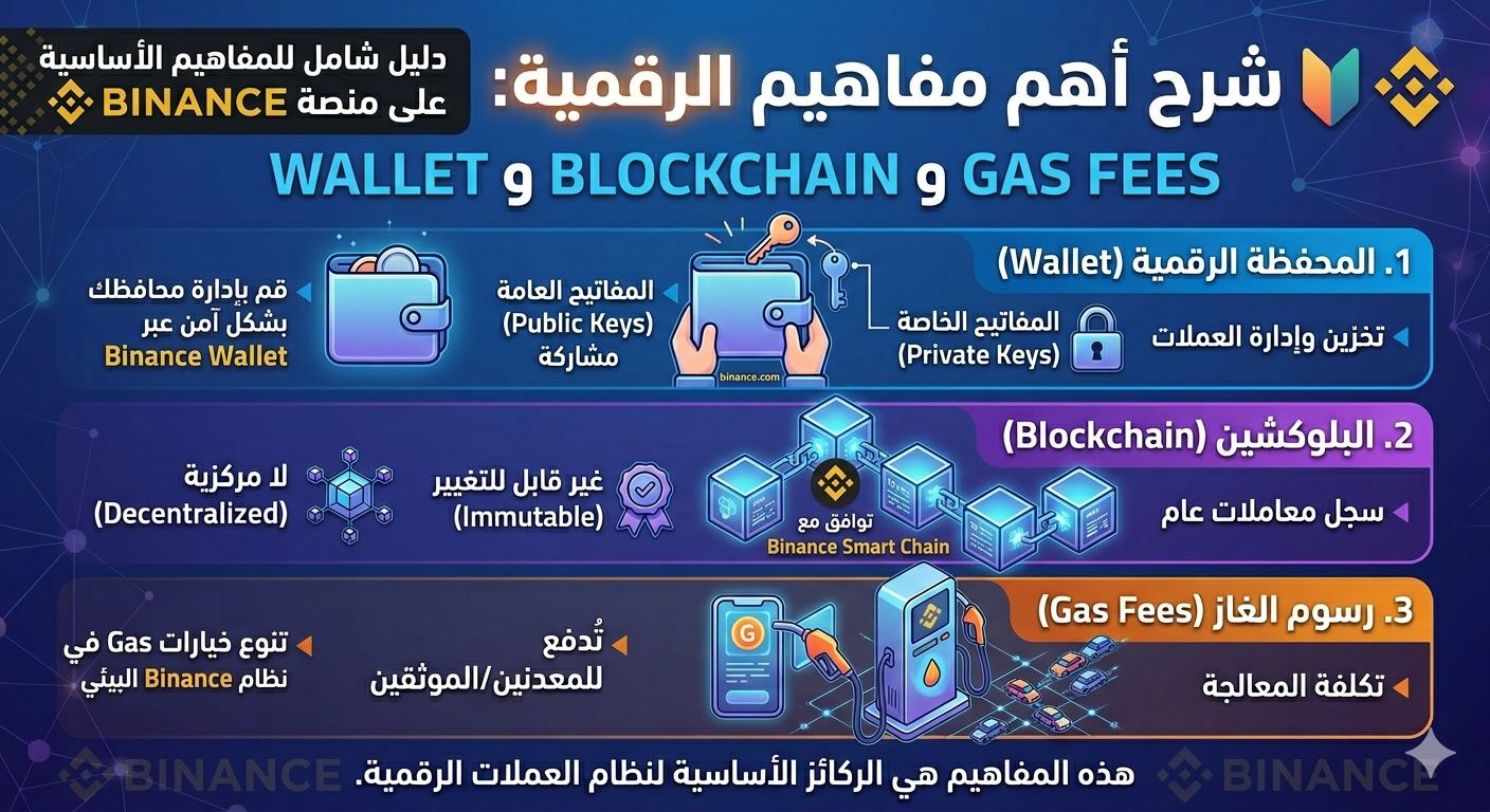 إذا كنت مبتدئًا في عالم العملات الرقمية، فهناك ثلاثة مصطلحات أساسية يجب أن تفهمها جيدًا: المحفظة (Wallet)، البلوكشين (Blockchain)، ورسوم الغاز (Gas Fees).