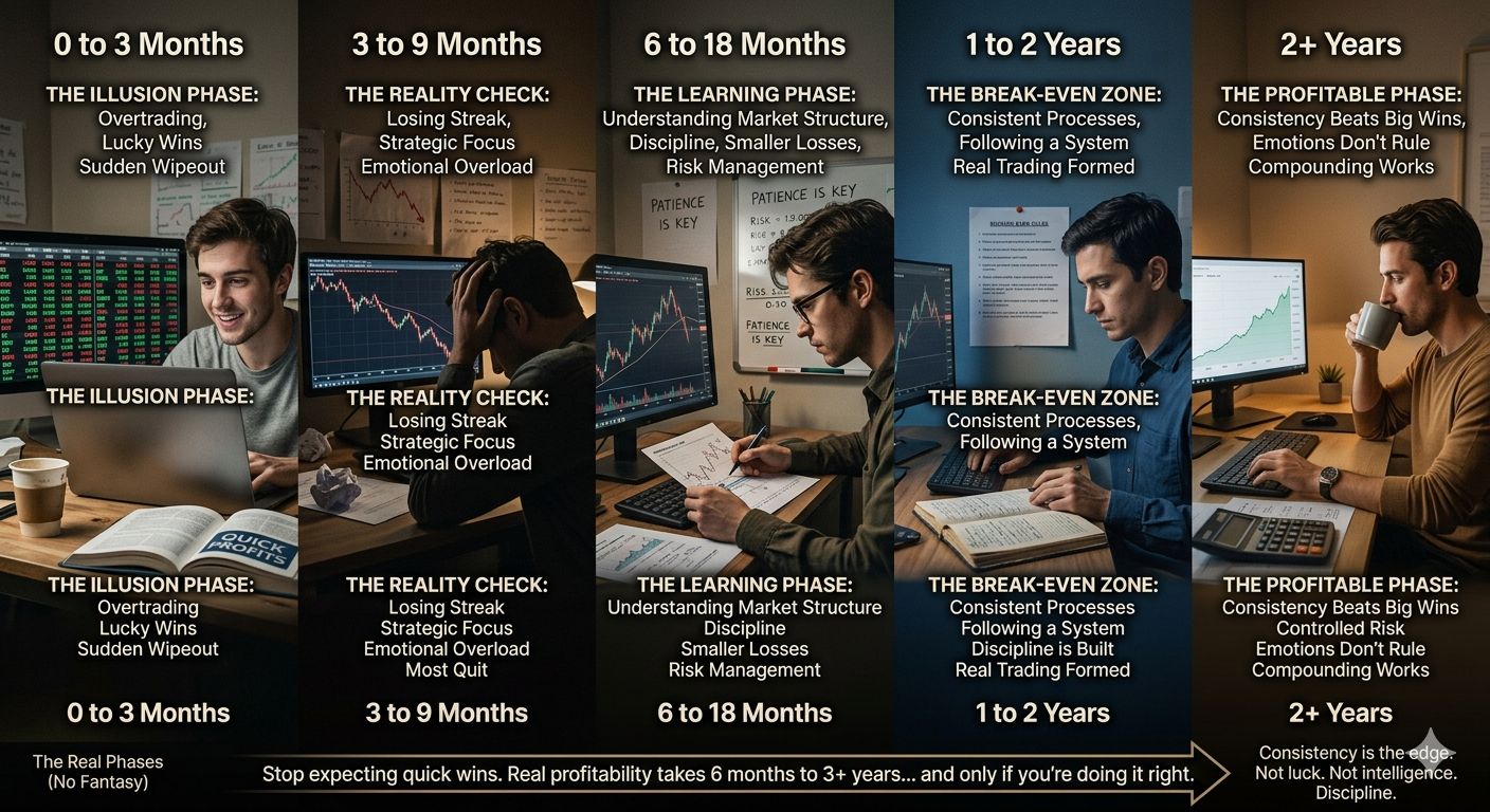 Stop expecting quick wins. Real profitability in trading usually takes 6 months to 3+ years and that’s if you’re doing things right.