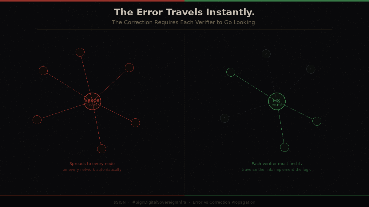 On a public blockchain, the propagation problem runs in the opposite direction. The incorrect record propagates instantly and completely to every node on every supported network. The correction, a new attestation linked back to the old one, requires every verifier to implement their own logic to find it, traverse the link, and prefer the corrected version. There is no standard for how that traversal should work. There is no enforcement.
