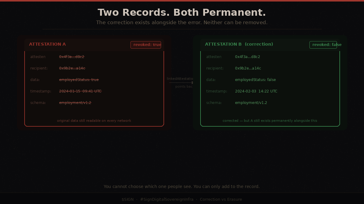 What I keep returning to is the asymmetry between who benefits from immutability and who bears the cost when something is wrong. Immutability benefits verifiers, institutions, and systems that want assurance that a record has not been tampered with after the fact. The cost of an incorrect but immutable record falls entirely on the person that record is about. That person cannot force the incorrect claim to disappear. They can only hope the issuer revokes it and that every system relying on the record checks the revocation flag and honors it.