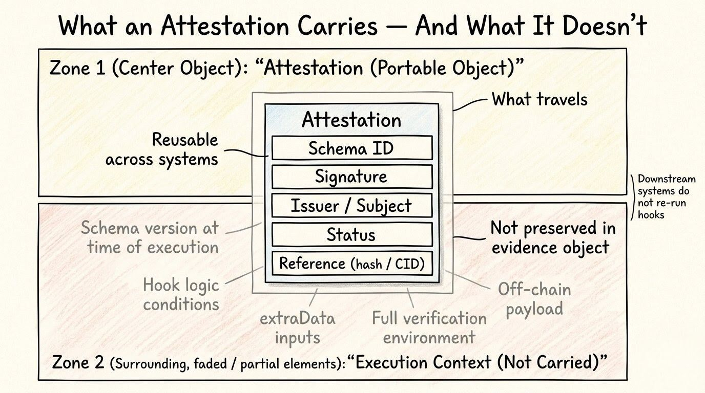so what exactly are we trusting when we look at an attestation? that the claim is true? or that at one specific moment, under one specific hook configuration, the schema hook did not reject it? those are not the same thing, and i keep circling that because it changes how the whole system feels. less like a permanent truth layer, more like a protocol that captures moments of non-rejection and then turns them into usable evidence.