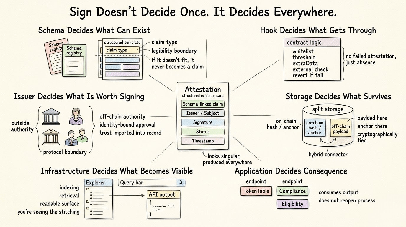 i thought the attestation was the decision. that’s how it looks from the outside anyway. something gets verified, signed, timestamped, stored, done. clean. it feels like Sign decided something there.
